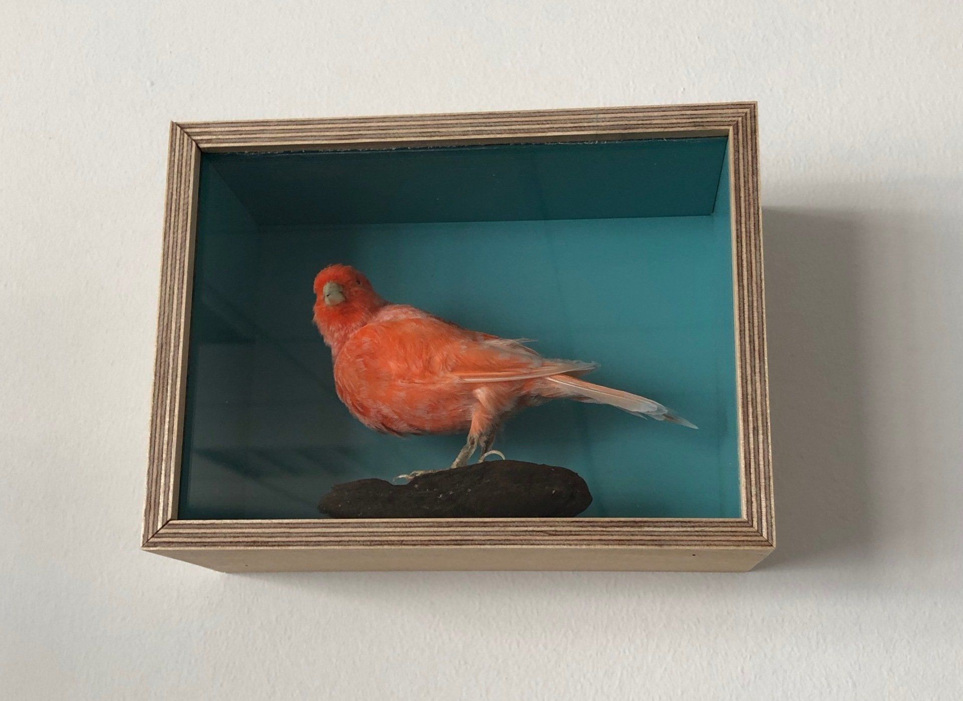 “Ik ben op zoek geweest naar een vorm voor mijn preparaten en ben uitgekomen bij mini-vitrines. Door de kleuren van de interieurs af te stemmen op de kleuren van de dieren ontstaat daarbinnen een nieuwe context. Waar het traditionele diorama vooral de natuurlijke wereld beoogt na te bootsen, roep ik met de kleuren eerder sferen op.